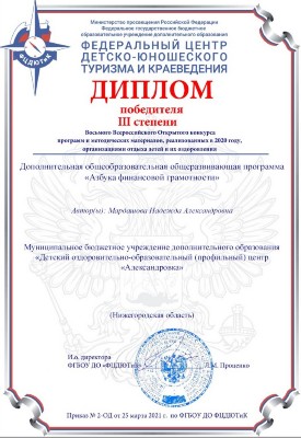 Диплом победителя III степени Восьмого Всероссийского открытого конкурса и методических материалов, реализованных в 2020 году, организациями отдыха детей и их оздоровления